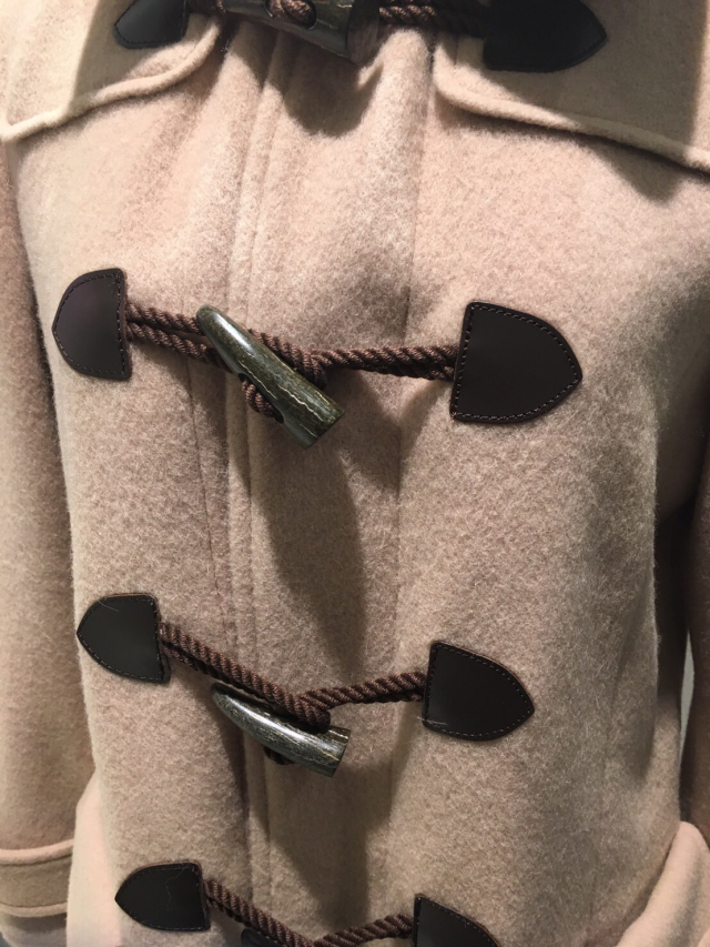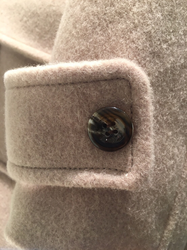 トグルボタンやレザー風パッチ、飾りボタンなど細部にもこだわりがあるコートになります。